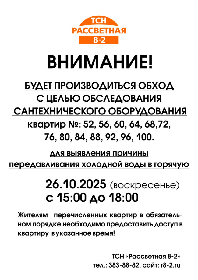 1 подъезде 26.10.2025 г. (воскресенье) с 15:00 до 18:00 будет производиться обход квартир