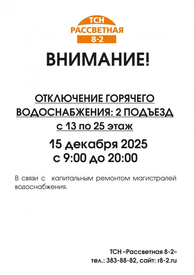 ОТКЛЮЧЕНИЕ ГОРЯЧЕГО ВОДОСНАБЖЕНИЯ: 2 ПОДЪЕЗД