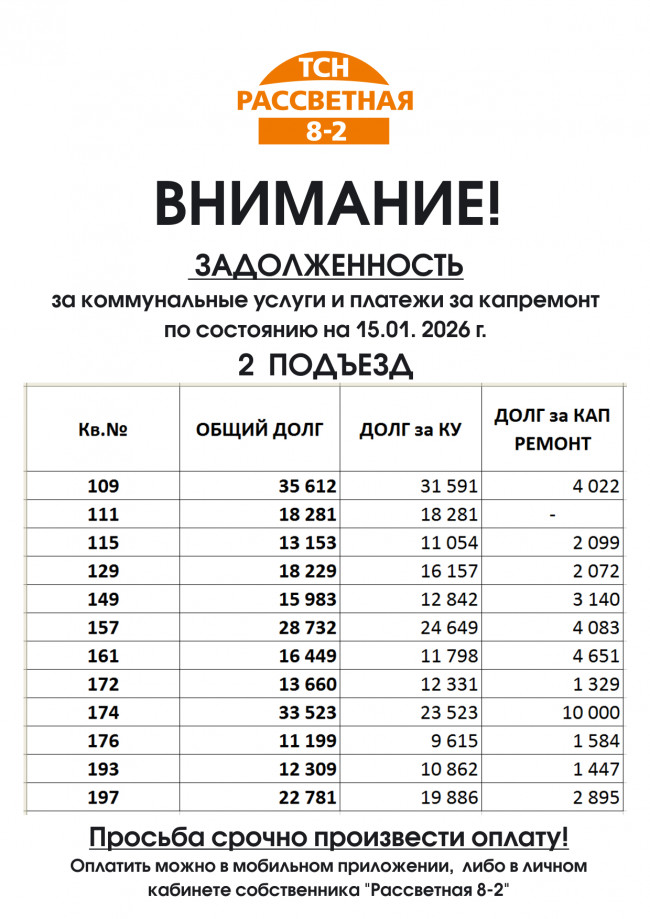 ВНИМАНИЕ! 2 ПОДЪЕЗД ЗАДОЛЖЕННОСТЬ за коммунальные услуги и платежи за капремонт