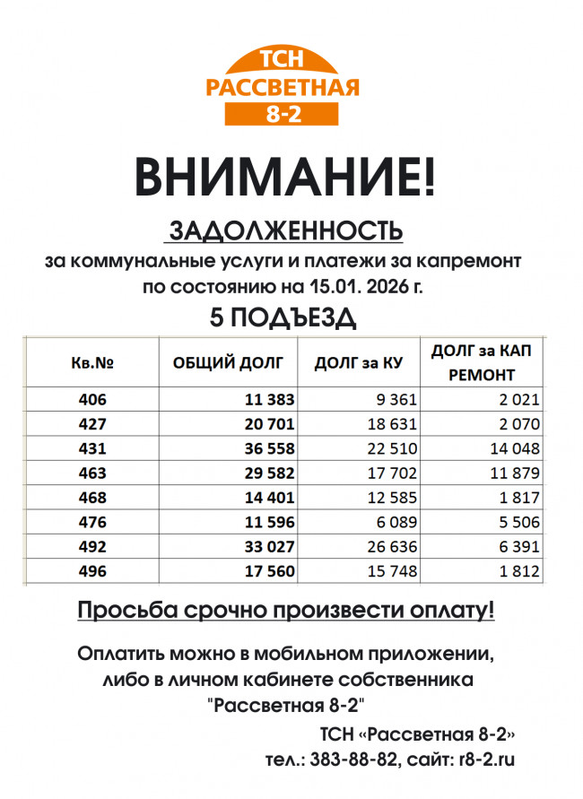 ВНИМАНИЕ! 5 ПОДЪЕЗД ЗАДОЛЖЕННОСТЬ за коммунальные услуги и платежи за капремонт