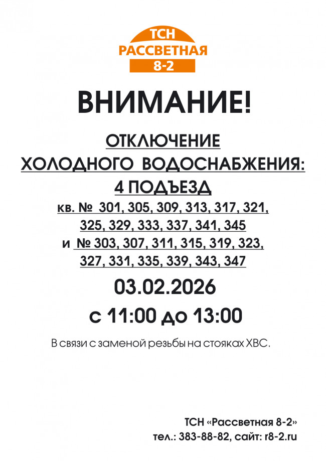 ОТКЛЮЧЕНИЕ ХОЛОДНОГО ВОДОСНАБЖЕНИЯ: 4 ПОДЪЕЗД 03.02.2026 с 11:00 до 13:00